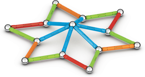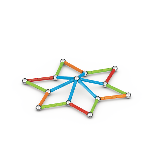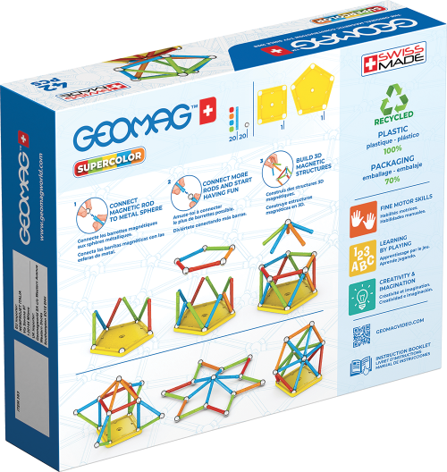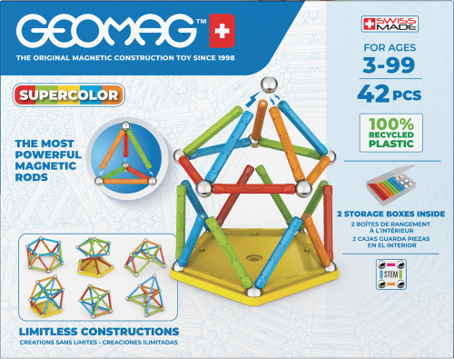 Všetky plasty použité na poťahy tyčiek a podstavcov sú zo 100% recyklovaného materiálu a ich dokonalé farby potešia aj tie najnáročnejšie. Súčasťou balenia sú navyše praktické transparentné úložné boxy, ktoré sú taktiež vyrobené z recyklovaného plastu. S nimi máte možnosť mať stavebnicu stále pri sebe a navyše prehľadne zrovnanú vo vreckovom balení. Stavebnica obsahuje 20 magnetických tyčiek rôznych farieb, 20 oceľových guličiek, 1 päťuholníkový a 1 štvorcový plastový podstavec. Celkom 42 dielikov. Stavebnica je vhodná pre deti od 3 rokov. Vyrobené vo Švajčiarsku.