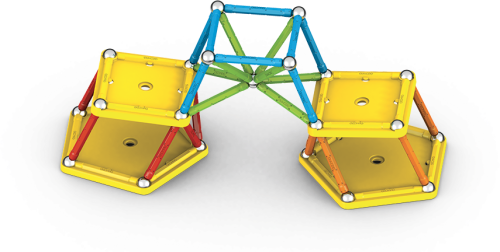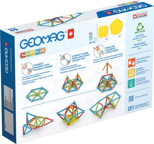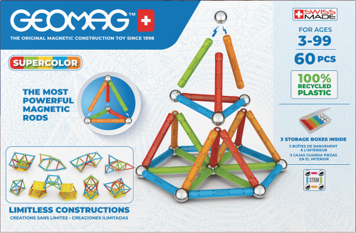 Všetky plasty použité na poťahy tyčiek a podstavcov sú zo 100% recyklovaného materiálu a ich dokonalé farby potešia aj tie najnáročnejšie. Súčasťou balenia sú navyše praktické transparentné úložné boxy, ktoré sú taktiež vyrobené z recyklovaného plastu. S nimi máte možnosť mať stavebnicu stále pri sebe a navyše prehľadne zrovnanú vo vreckovom balení. Stavebnica obsahuje 28 magnetických tyčiek rôznych farieb, 28 oceľových guličiek, 2 päťuholníkové a 2 štvorcové plastové podstavce. Celkom 60 dielikov. Stavebnica je vhodná pre deti od 3 rokov. Vyrobené vo Švajčiarsku.