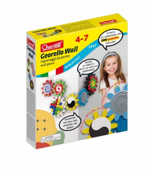 Georello Wall vám prináša skvelú zábavu a možnosť vyzdobiť múry vášho domova farebnými ozubenými kolieskami. Vďaka priloženým špeciálnym lepiacim vankúšikom UHU patafix môžete kolieska na tisíc spôsobov upevňovať na stene či iné zvislé povrchy a zase ich z nich dávať dole bez toho, aby ste ich poškodili. Bavte sa a zároveň sa učte: roztočte jedno ozubené koliesko a sledujte, ako sa úžasnou reťazovou reakciou roztočia aj ostatní. Špeciálne priľnavé vzory pre prevodové kolieska vás okúzlia ilúziou pohybu závislou na rýchlosti otáčania. Vďaka svojim vlastnostiam je táto jedinečná stavebnica výnimočnou vzdelávacou hračkou, ktorá zaručuje množstvo hodín praktickej, poučnej a bezpečnej zábavy. Obsah: - 4 menšie ozubené kolieska, - 2 väčšie ozubené kolieska, - 6 osí, - 4 balenia lepiacich vankúšikov, - 60 kolíčkov v 4 farbách, - 1 hárok priľnavých vzorov. QUERCETTI® je celosvetovo známa a uznávaná talianska značka, ktorá na európskom trhu pôsobí už vyše 60 rokov. Pretože sú v Českej republike stále viac žiadané hračky špičkovej kvality a designu, získala si počas posledných rokov svojich verných zákazníkov aj u nás. V jej ponuke nájdeme stavebnice pre deti od jedného roka, unikátne mozaiky pre deti už od dvoch rokov, pohybové stavebnice Georella, guličkové dráhy a ďalšie. QUERCETTI® je pre svoje edukatívne vlastnosti a kvalitu veľmi obľúbenou značkou aj v materských školách. Jej výrobky u detí rozvíjajú jemnú motoriku, logické myslenie, vizuomotorickú koordináciu aj estetické cítenie.