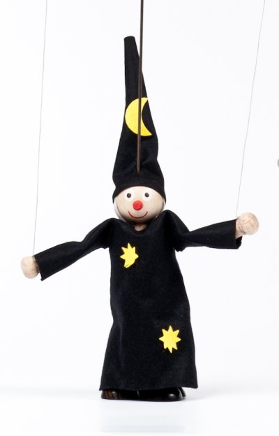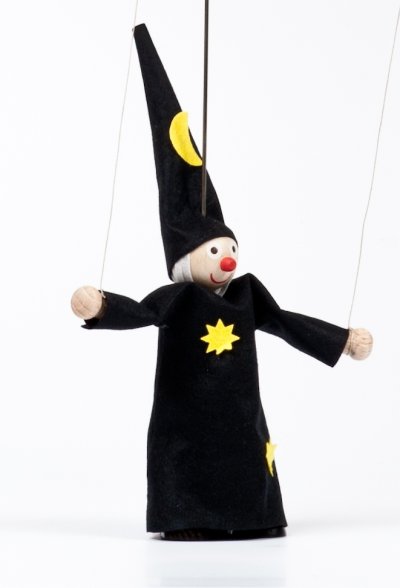 V mnohých rozprávkach je nevyhnutný zlý čarodejník. Čo napríklad rozprávka O Dlhom, Širokom a Bystrozrakom. Bábka do Gerlichovho divadla je určená pre deti od 3 rokov. Náš Viliam však môže byť aj veľmi hodný kúzelník. Vyskúšajte si ho sami. Veľkosť bábky je vďaka černokňažníckemu klobúku 19 cm bez vodiaceho drôtika, vďaka nitkám má pohyblivé ruky. Produkt sa môže líšiť vo farebných detailoch. Hlavné vlastnosti: ručne vyrábaná bábka z chránenej dielne veľkosť bábky je 19 cm bez vodiaceho drôtika vďaka vodiacim nitiam, má bábka pohyblivé ruky