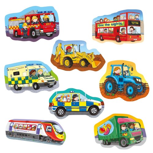 Osem silných detských puzzle s dopravnými prostriedkami s rôznym počtom dielikov (4 - 16 dielikov). Na zadnej strane puzzle je farebne odlíšená potlač pre ľahšie triedenie dielikov. Balenie je bez plastových obalov.
