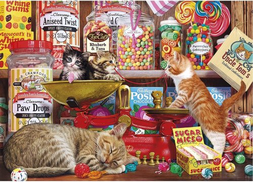 V cukrárni deda Toma sa objavili tri nezbedné mačiatka. Podarí sa im prehrýzť všetkými Tlapkovými kvapkami, Catburyho čokoládami a Cukrovými myškami, než sa starý otec prebudí? Súčasťou balenia je predloha skladaného motívu.