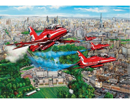 Lietadlá Red Arrows sú na leteckých prehliadkach obľúbené už od svojho prvého vystúpenia v roku 1965 a na ich obratné akrobatické manévre je vždy radosť pozerať. Svoju úlohu hrajú aj pri oslavách kráľovských a vojenských udalostí, kedy sa zúčastňujú preletu nad Buckinghamským palácom. Patria medzi ne kráľovniny narodeniny, kráľovské svadby a britské vojenské udalosti, ako je napríklad Trooping the Colour. Na prelete sa zúčastňuje všetkých deväť stíhačiek a na tejto scéne sú vidieť štyri stíhačky z pravej strany formácie. Súčasťou balenia je predloha skladaného motívu.