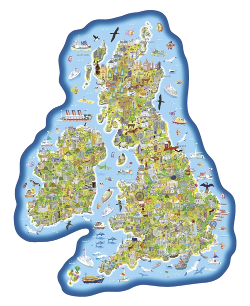 Bohato ilustrované obrysové puzzle Veľkej Británie a Írska s obrázkami zvierat, pamätihodností a zaujímavostí, ktoré sú typické pre jednotlivé oblasti Britských ostrovov. Okrem množstva detailov obsahuje puzzle navyše špeciálne rovnako tvarované dieliky s názvami grófstva, ktoré je možné umiestniť priamo do puzzle obrázku. Puzzle tak zároveň slúži ako vynikajúca pomôcka pre vzdelávanie a zlepšovanie zemepisných znalostí. Rozmer zloženého puzzle cca 48 x 62 cm