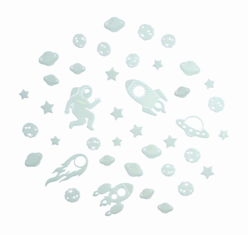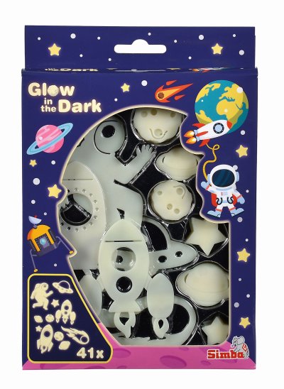 Sada fluorescenčných hviezdičiek, astronauta, vesmírnej lode a ďalších motívov, ktoré po nasvietení v tme svietia. Dekorácia vhodná na nalepenie na stenu, strop či nábytok. Vrátane lepiacej gumy. Súprava obsahuje 41 ks.