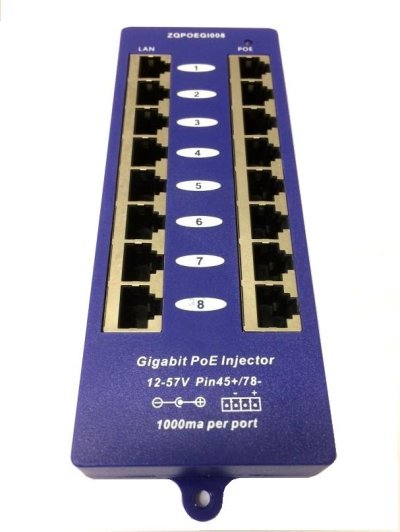 Panel integrujúci osem gigabitových pasívnych POE injektorov s napájacím rozsahom 12-57V a max. prúdom 1000mA/port.