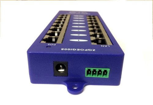 Rozhranie: 8x tienený RJ45 konektor pre pripojenie do LAN (Data) 8x tienený RJ45 konektor pre zlúčený výstup (Data+Napájanie) LED signalizácia: Power OFF -- bez signalizácie 4/5 (V+),7/8 (V-) -- zelená 4/5 (V-),7/8 (V+) -- červená