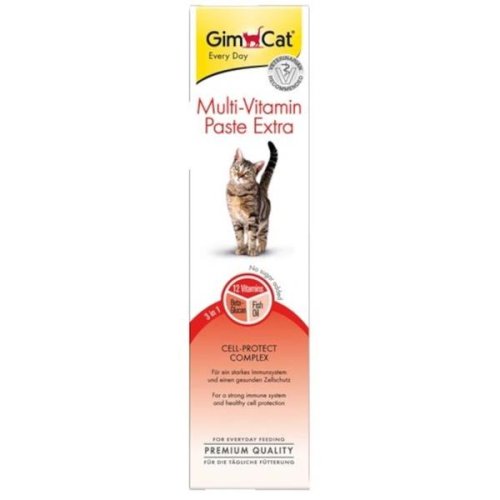 Pasta GimCat Multi-Vitamín Extra je lahodná pochúťka a zároveň doplnok stravy, ktorý podporuje zdravie mačiek. Obsahuje inovatívnu kombináciu dvanástich životne dôležitých vitamínov, kvalitného rybieho tuku a betaglukánu na posilnenie imunitného systému. Komplex omega-3 a omega-6 mastných kyselín v jedinečnej receptúre prispieva k správnemu fungovaniu mozgu a zraku. Hlavné prednosti pasty:
