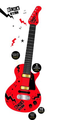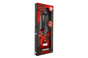 Detská farebná gitara pre všetkých milovníkov nielen rockovej hudby. Červená gitara s čiernymi plameňmi a bielymi doplnkami. Gitara vie nielen hrať, ale hudbu sprevádza aj svetelnými efektmi! Funkcia gitary: svetelné efekty, päť demo nahrávok, 10 melódií a zvukové efekty strún... Veľkosť gitary: 58 cm Rozmer balenia: 24 x 62 x 5,5 cm Vhodné pre deti od 3 rokov
