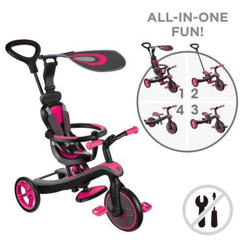 Vyvíjajúca sa trojkolka 4 v 1 sa vďaka rôznym režimom prispôsobuje rastu vášho dieťaťa. V režime komfortnej trojkolky od 10 mesiacov má táto vyvíjajúca sa trojkolka všetku výbavu, ktorá zaručuje bezpečnosť a pohodlie: vysoké sedátko nastaviteľné do 2 výšok, opierka hlavy, zadné brzdy (na každom kolese), 5-bodový bezpečnostný pás, bezpečnostné madlo a odnímateľný ochranný kryt. -UV sklápacia slnečná clona. Smerová palica je nastaviteľná do 2 výšok. V trojkolesovom režime, vedenom alebo autonómnom, sa protišmykové sedlo nastavuje do 2 výškových úrovní, opierka nôh je odnímateľná s integrovaným úložným priestorom. Montáž, demontáž, zmena režimov bez náradia. Pohodlná trojkolka, ktorá sa premení na balančné koleso. Komfortný trojkolkový režim: od 10 do 36 mesiacov. Režim riadenej trojkolky: od 18 do 36 mesiacov. Autonómny trojkolkový režim: od 24 do 36 mesiacov. Režim vyváženého kolesa: od 2 do 5 rokov. Vek: 10 mesiacov až 5 rokov. Hmotnosť Kompletná trojkolka: 6,75 Kg. Maximálna nosnosť 20kg. Prítlačná tyč: nastaviteľná do 2 úrovní 92 a 96 cm. Sedák: nastaviteľný do 2 úrovní 32 a 35 cm. Predné koleso (250 mm) - zadné kolesá (220 mm) z EVA peny, odolné proti prepichnutiu a tiché. Zakrivené riadidlá s ergonomickými, mäkkými a odolnými rukoväťami. Rozmery režimu Komfortná trojkolka: V. 92/96 cm x D. 95 x l. 47 - váha 6,75 Kg. Rozmery vedená trojkolka: V. 92/96 cm x D. 95 x d. 47 - hmotnosť 5,35 Kg. Rozmery autonómna trojkolka: V 53 cm x D. 76,5 x l. 47 - hmotnosť 4,46 Kg. Rozmery autonómna trojkolka: V 53 cm x D. 76,5 x l. 38 - váha 4,28 Kg.