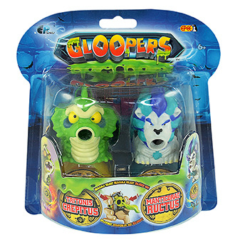Toto sú Gloopers, príšerky, ktoré vcucnou snáď každý sliz, na ktorý práve narazí. A vie ho taky pekne pľuvať okolo seba. Stlačte figúrku a nasajte sliz príslušným otvorom na ústach alebo nosa. Potom figúrku opäť stlačte a pľuvať ... .. sliz je zase vonku. Zbierajte je a užite si ešte viac slizské zábavy. Každú figúrku možno pripevniť na banku, v ktorej je sliz. Sada obsahuje 2 figúrky Gloopers a 2 banky sa slizom. Pre deti od 6 rokov.