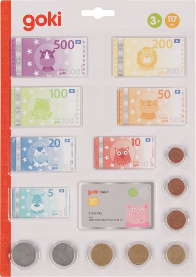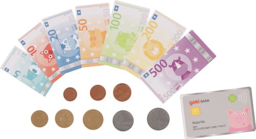 Rozmery bankoviek: max 8 x 4 cm, min 6 x 3,2 cm. Rozmery mincí: Ø 1,5 - 2,6 cm. Rozmery kreditnej karty: 8 x 5 cm. Balenie obsahuje: 117 ks mincí a bankoviek vrátane kreditnej karty (8 druhov euro mincí po 4 ks, 7 druhov bankoviek). GOKI patrí medzi najvýznamnejších európskych výrobcov hračiek s vysokou pedagogickou a didaktickou kvalitou. Firma kladie dôraz na bezpečnosť hračiek, ich zdravotnú nezávadnosť a dbá na obnoviteľné zdroje. Drevo je brané tam, kde môže dorastať. Používané dreviny sú javor, buk, orech, lipa, jaseň, borovica, breza a gumovník. Farby a laky pochádzajú od menších výrobcov.
