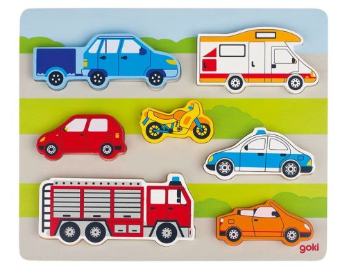 rozvoj koordinácie oko-ruka, logického myslenia a predstavivosti, drevená podložka uľahčuje skladanie a rámčeky zabezpečujú, aby jednotlivé drevené autá držali na svojich miestach, vkladacie dieliky môžu slúžiť aj ako figúrka na hranie.