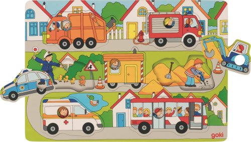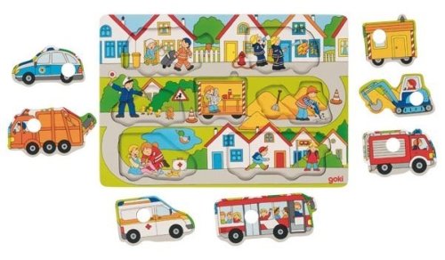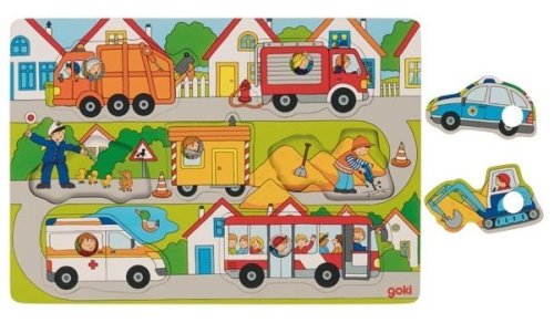 Jednotlivé dieliky s obrázkami majú okrúhle výrezy pre lepšie vybratie av nich je vidieť obrázok, ktorý sa po vybratí dielikov objaví celý. Je zaručené, že zvedavosť detí nenechá dospelákov na izbe. Je potrebné objavovať a rozprávať sa o tom, čo sa deje na cestách. Podporuje rozvoj koordinácie oko-ruka, logického myslenia a predstavivosti, obrázková drevená podložka uľahčuje skladanie a rámčeky zabezpečujú, aby jednotlivé drevené vozidlá držali na svojich miestach.