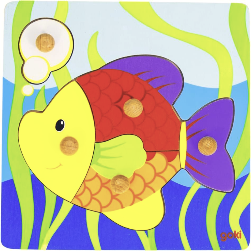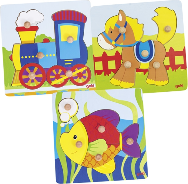 Jednotlivé dieliky s obrázkami majú úchytky. Podporuje rozvoj koordinácie oko-ruka, logického myslenia a predstavivosti. Drevená podložka s vyrezaným obrysom skladaného obrázku zabezpečí, aby poskladaný obrázok držal na svojom mieste.