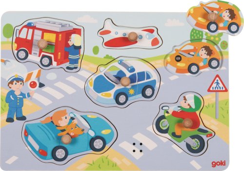 Drevené zvukové puzzle s obrázkami dopravných prostriedkov na rušnej križovatke. Po vložení obrázku sa ozve charakteristický zvuk vozidiel. Jednotlivé dieliky majú drevené úchytky pre ľahšiu manipuláciu.