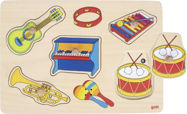 Drevené zvukové puzzle s obrázkami hudobných nástrojov. Po vložení obrázku sa ozve charakteristický zvuk.