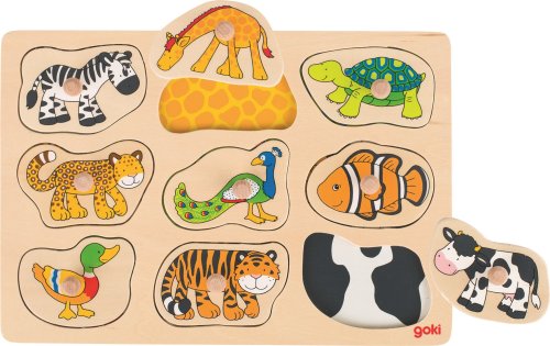 rozvoj koordinácie oko-ruka, logického myslenia a predstavivosti, drevená podložka uľahčuje skladanie a rámčeky zabezpečujú, aby jednotlivé drevené zvieratká držali na svojich miestach, každé zvieratko má podkladový obrázok, drevené úchytky pre ľahšiu manipuláciu.