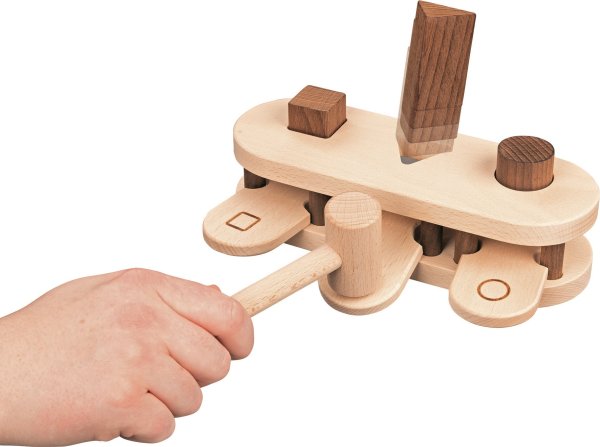 Do ktorého katapultu musí kladivo udrieť, aby sa drevená tehla v tvare trojuholníka dostala von? Zábavná hra pre malých kúmakov v štýle akcie - reakcie. GOKI patrí medzi najvýznamnejších európskych výrobcov hračiek s vysokou pedagogickou a didaktickou kvalitou. Firma kladie dôraz na bezpečnosť hračiek, ich zdravotnú nezávadnosť a dbá na obnoviteľné zdroje. Drevo je brané tam, kde môže dorastať. Používané dreviny sú javor, buk, orech, lipa, jaseň, borovica, breza a gumovník. Farby a laky riediteľné vodou pochádzajú od menších výrobcov.
