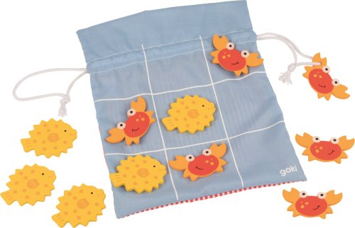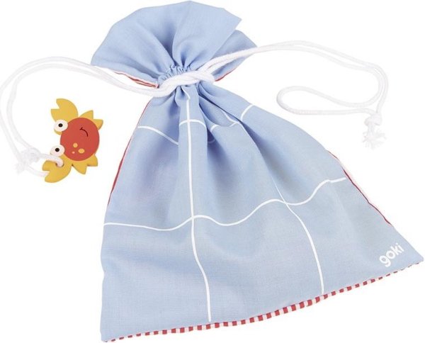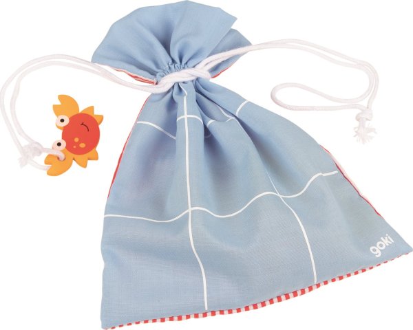 Rýchla strategická hra pre 2 hráčov v praktickom balení, vhodná na cesty. Kraby proti rybičkám - farebné obrázky vyrezávané z dreva perfektne padnú do drobnej detskej ruky. Hra obsahuje: bavlnené vrecko s krabom, 5 krabov, 5 rybičiek. GOKI patrí medzi najvýznamnejších európskych výrobcov hračiek s vysokou pedagogickou a didaktickou kvalitou. Firma kladie dôraz na bezpečnosť hračiek, ich zdravotnú nezávadnosť a dbá na obnoviteľné zdroje. Drevo je brané tam, kde môže dorastať. Používané dreviny sú javor, buk, orech, lipa, jaseň, borovica, breza a gumovník. Farby a laky pochádzajú od menších výrobcov.