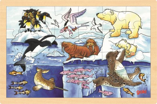 Detské puzzle z dreva. Dieliky sú umiestnené na drevenej doske s vyfrézovaným obrysom na uľahčenie skladania. Skladanie puzzle rozvíja fantáziu a podporuje rozvoj motoriky. Odporúčané pre deti od 3 rokov. GOKI patrí medzi najvýznamnejších európskych výrobcov hračiek s vysokou pedagogickou a didaktickou kvalitou. Firma kladie dôraz na bezpečnosť hračiek, ich zdravotnú nezávadnosť a dbá na obnoviteľné zdroje. Drevo je brané tam, kde môže dorastať. Používané dreviny sú javor, buk, orech, lipa, jaseň, borovica, breza a gumovník. Farby a laky pochádzajú od menších výrobcov. Rozmer zloženého puzzle cca 28 x 18 cm