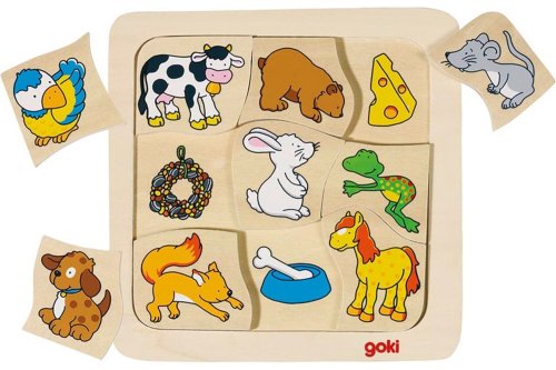 Detské skladačka z dreva. Dieliky sú umiestnené na drevenej doske s vyfrézovaným obrysom na uľahčenie skladania. Skladanie puzzle rozvíja fantáziu a podporuje rozvoj motoriky. Odporúčané pre deti od 2 rokov. GOKI patrí medzi najvýznamnejších európskych výrobcov hračiek s vysokou pedagogickou a didaktickou kvalitou. Firma kladie dôraz na bezpečnosť hračiek, ich zdravotnú nezávadnosť a dbá na obnoviteľné zdroje. Drevo je brané tam, kde môže dorastať. Používané dreviny sú javor, buk, orech, lipa, jaseň, borovica, breza a gumovník. Farby a laky pochádzajú od menších výrobcov. Rozmer zloženého puzzle cca 18 x 18 cm