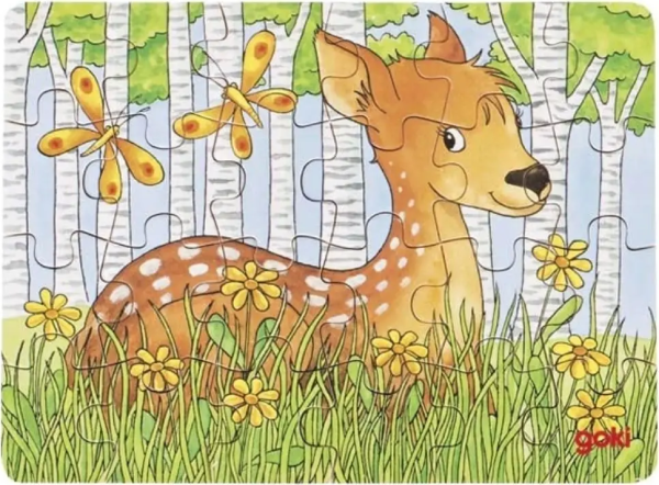Detské puzzle z dreva s motívom obyvateľov lesa. Skladanie puzzle rozvíja fantáziu a podporuje rozvoj motoriky. Odporúčané pre deti od 4 rokov. GOKI patrí medzi najvýznamnejších európskych výrobcov hračiek s vysokou pedagogickou a didaktickou kvalitou. Firma kladie dôraz na bezpečnosť hračiek, ich zdravotnú nezávadnosť a dbá na obnoviteľné zdroje. Drevo je brané tam, kde môže dorastať. Používané dreviny sú javor, buk, orech, lipa, jaseň, borovica, breza a gumovník. Farby a laky pochádzajú od menších výrobcov. Rozmer zloženého puzzle cca 17 x 12 cm