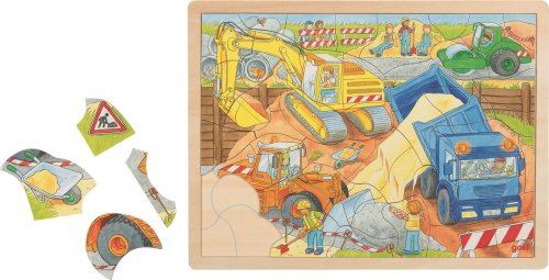 Detské puzzle z dreva s motívom rušnej scény na stavenisku. Dieliky sú umiestnené na drevenej doske s vyfrézovaným obrysom na uľahčenie skladania. Puzzle nemá štandardný tvar dielikov ako ich poznáme z klasického skladania, ale obrázok je zložený z častí nepravidelného tvaru bez zámkov, akoby ho niekto rozpraskal. Skladanie puzzle rozvíja fantáziu a podporuje rozvoj motoriky. Odporúčané pre deti od 3 rokov. GOKI patrí medzi najvýznamnejších európskych výrobcov hračiek s vysokou pedagogickou a didaktickou kvalitou. Firma kladie dôraz na bezpečnosť hračiek, ich zdravotnú nezávadnosť a dbá na obnoviteľné zdroje. Drevo je brané tam, kde môže dorastať. Používané dreviny sú javor, buk, orech, lipa, jaseň, borovica, breza a gumovník. Farby a laky pochádzajú od menších výrobcov. Rozmer zloženého puzzle cca 38 x 28 cm