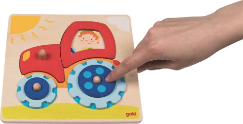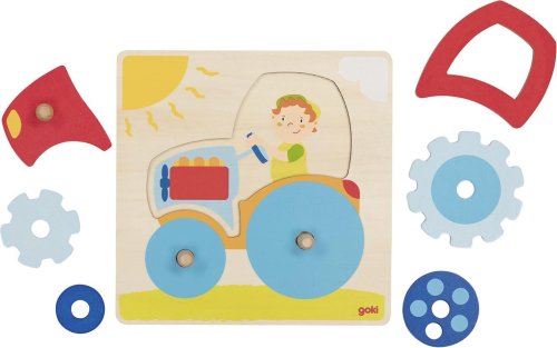 Detské vkladacie puzzle z dreva. Dieliky sú umiestnené na drevenej doske s vyfrézovaným obrysom na uľahčenie skladania. Skladanie puzzle rozvíja fantáziu a podporuje rozvoj motoriky. Odporúčané pre deti od 1 roku. GOKI patrí medzi najvýznamnejších európskych výrobcov hračiek s vysokou pedagogickou a didaktickou kvalitou. Firma kladie dôraz na bezpečnosť hračiek, ich zdravotnú nezávadnosť a dbá na obnoviteľné zdroje. Drevo je brané tam, kde môže dorastať. Používané dreviny sú javor, buk, orech, lipa, jaseň, borovica, breza a gumovník. Farby a laky pochádzajú od menších výrobcov.