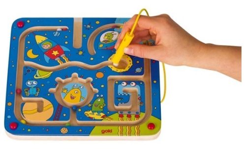 Farebná magnetická hra Vesmír poteší každé dieťa a nabáda k hre. K doske je pripevnená magnetická tyč na povrázku, s ktorou by sa guličky mali pohybovať. Guličky je možné viesť celým bludiskom dvoma spôsobmi. Prvým spôsobom (tradične) - pomocou magnetickej „tyče“, ktorá vyžaduje, aby sa dieťa sústredilo Druhým spôsobom - k rôznym cieľom, rozdeliť podľa farieb. Hračka je vyrobená z dreva, bludiska a guličky sú za pevným a priehľadným plexisklom. Hra precvičuje koordináciu ruka – oko a jemnú motoriku. Vhodné pre deti od 18 mesiacov. Rozmery hračky: 21 x 21 x 1,7 cm GOKI patrí medzi najvýznamnejších európskych výrobcov hračiek s vysokou pedagogickou a didaktickou kvalitou. Firma kladie dôraz na bezpečnosť hračiek, ich zdravotnú nezávadnosť a dbá na obnoviteľné zdroje. Drevo je brané tam, kde môže dorastať. Používané dreviny sú javor, buk, orech, lipa, jaseň, borovica, breza a gumovník. Farby a laky pochádzajú od menších výrobcov.