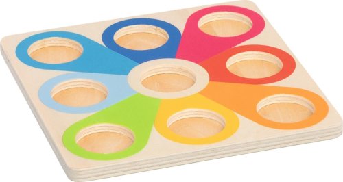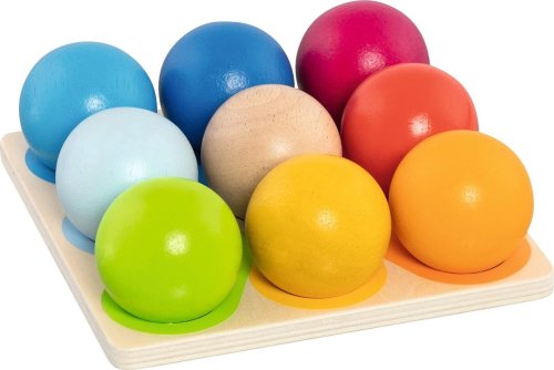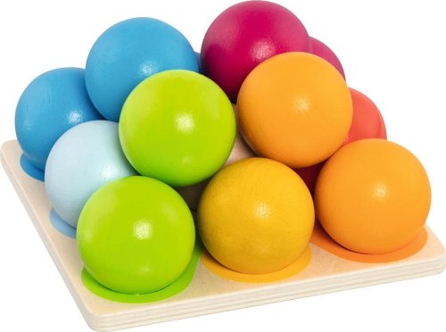 Štrnásť krásne veľkých a farebných guličiek, ktoré majú široké využitie vo svete detí. Deti sa učia farby pomenovať, triediť ich k sebe a správne priradiť na podkladovú dosku. Skladanie pyramídy do výšky ponúka rôzne kombinácie a podporuje tak fantáziu a cit pre farby. Samozrejme trénuje aj motorické zručnosti a trpezlivosť. A pretože sa z podstaty veci kotúľajú, nenechajú deti sedieť na mieste. Vyrobené z dreva. Guľôčka má priemer 4,6 cm, hrana podkladovej dosky 15 cm. Vhodné od 1 roku. GOKI patrí medzi najvýznamnejších európskych výrobcov hračiek s vysokou pedagogickou a didaktickou kvalitou. Firma kladie dôraz na bezpečnosť hračiek, ich zdravotnú nezávadnosť a dbá na obnoviteľné zdroje. Drevo je brané tam, kde môže dorastať. Používané dreviny sú javor, buk, orech, lipa, jaseň, borovica, breza a gumovník. Farby a laky pochádzajú od menších výrobcov.