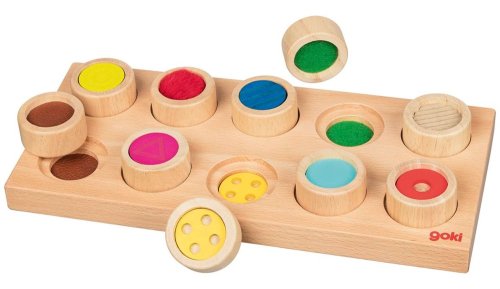 Hracie kamene v tvare minivalčekov z masívneho dreva (výška 2 cm, Ø 4 cm), 10 rôznych povrchov, hra stimuluje hmat, cit a ďalšie zmyslové vnemy, minivalčeky sa otočia lícom dole, zamiešajú, hráč si bez pozerania jeden vezme a iba hmatom sa snaží ho správne umiestniť do otvoru s rovnakým povrchom.