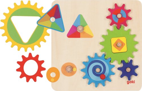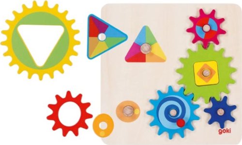 Skladanie farebných drevených ozubených kolies na podložku je len polovica zábavy. Až po umiestnení modrého kolesa sa ukáže či plán vyšiel – otáčajú sa všetky kolesá? A ktorým smerom sa otáčajú?