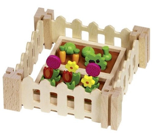 Komplet pre malých záhradníkov obsahuje 32 doplnkov z masívneho dreva. Hodí sa k domčekom pre bábiky alebo na samostatné hranie. Na dvoch záhonoch (7,7 x 5 x 1,8 cm) je možné pestovať zeleninu, ohradiť ich malým plotom a nechýba ani potrebné náradie, semienka a sadenice. Set pre zahradničení podporuje fantáziu a je inšpirujúcou a vzdelávacou hračkou.