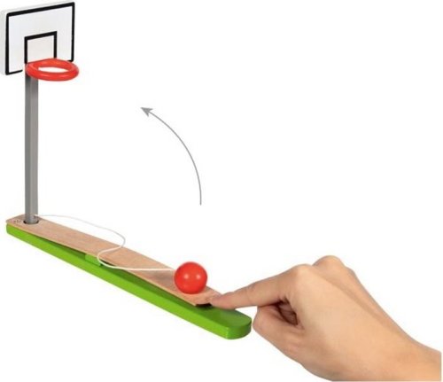 Táto drevená hračka je tiež zábavným spestrením pre dospelých, ale to nemusí znamenať, že sa dokážu trafiť do koša lepšie ako deti. Loptička nestratíte, pretože je pripevnená k povrázku. Precvičuje motoriku a koordináciu pohybov, zručnosť a rýchle reakcie.