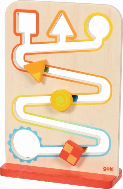 Rozmery dráhy sú cca 31 x 21 x 8 cm. Balenie obsahuje drevenú dráhu a tri dieliky s odlišným tvarom aj farbou.