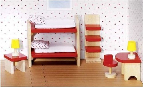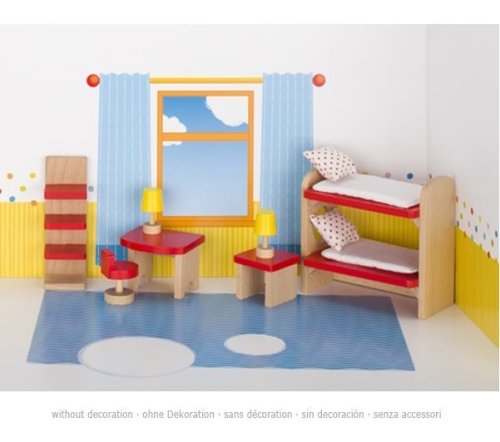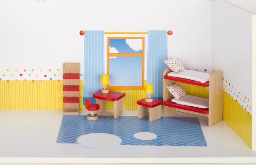Komplet v klasickom dizajne pre pohyblivé bábiky patrí do série Goki Basic. Hodí sa do domčekov alebo na samostatné hranie. Vhodné do všetkých domčekov pre bábiky značky Goki. Solídny a stabilný nábytok z masívneho dreva. Výška poschodovej postele je cca 10 cm. Balenie obsahuje 11 ks nábytku a doplnkov.