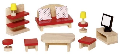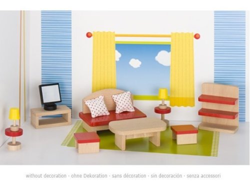 Komplet v klasickom dizajne pre pohyblivé bábiky patrí do série Goki Basic. Hodí sa do domčekov alebo na samostatné hranie. Vhodné do všetkých domčekov pre bábiky značky Goki. Solídny a stabilný nábytok z masívneho dreva. Výška policovej skrinky, regálu je 8 cm. Balenie obsahuje 13 ks nábytku a doplnkov.