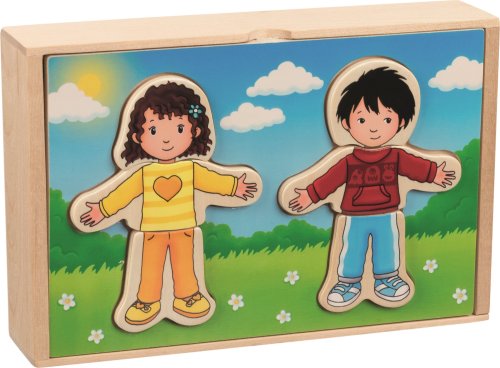 Obľúbená drevená "obliekacia" skladačka pre malé deti s chlapcom a dievčatkom. Vymieňajte s deťmi postavičkám hlavy, telo a nožičky a kombinujte oblečenie na rôzne príležitosti. Hlavičky detí taktiež vyjadrujú rôzne nálady. Bude sa im oblečenie páčiť? Balené v drevenej krabičke s vekom, ktoré slúži zároveň ako podložka na skladanie. Podporuje rozvoj jemnej motoriky, predstavivosti a logického uvažovania. GOKI patrí medzi najvýznamnejších európskych výrobcov hračiek s vysokou pedagogickou a didaktickou kvalitou. Firma kladie dôraz na bezpečnosť hračiek, ich zdravotnú nezávadnosť a dbá na obnoviteľné zdroje. Drevo je brané tam, kde môže dorastať. Používané dreviny sú javor, buk, orech, lipa, jaseň, borovica, breza a gumovník. Farby a laky pochádzajú od menších výrobcov. .