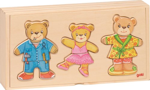 Obľúbená drevená "oblékací" skladačka s množstvom oblečenia nazývaná tiež Šatníková skriňa pre malé deti s trojčlenne medvedí rodinou. Vymieňajte s deťmi postavičkám hlavy, telo a nožičky a kombinujte oblečenie na rôzne príležitosti. Celkom 12 sád = 36 dielikov. Balené v drevenej krabičke s vekom, ktoré slúži zároveň ako podložka na skladanie. GOKI patrí medzi najvýznamnejších európskych výrobcov hračiek s vysokou pedagogickou a didaktickou kvalitou. Firma kladie dôraz na bezpečnosť hračiek, ich zdravotnú nezávadnosť a dbá na obnoviteľné zdroje. Drevo je brané tam, kde môže dorastať. Používané dreviny sú javor, buk, orech, lipa, jaseň, borovica, breza a gumovník. Farby a laky pochádzajú od menších výrobcov.