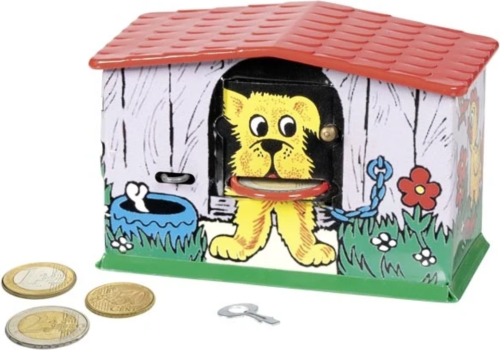 Pokladnička s motívom psíka v tvare búdy. Vlastnosti:
