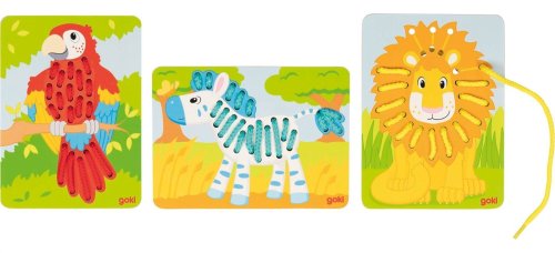 Balenie obsahuje: 3 obrázky, 3 druhy farebných šnúrok po 2 ks. GOKI patrí medzi najvýznamnejších európskych výrobcov hračiek s vysokou pedagogickou a didaktickou kvalitou. Firma kladie dôraz na bezpečnosť hračiek, ich zdravotnú nezávadnosť a dbá na obnoviteľné zdroje. Drevo je brané tam, kde môže dorastať. Používané dreviny sú javor, buk, orech, lipa, jaseň, borovica, breza a gumovník. Farby a laky pochádzajú od menších výrobcov.