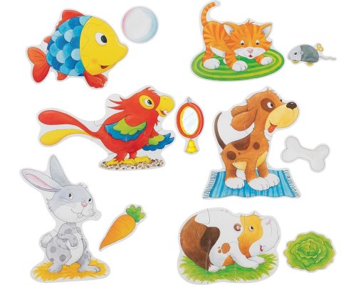 Poskladaj si obrázky domácich maznáčikov a pusť sa do priraďovania. Ku každému zvieratku patrí dielik, ktorý je pre dané zvieratko typický. Poznáš, ku komu patrím mrkva? A kto sa rád hrá s naťahovacou myškou?