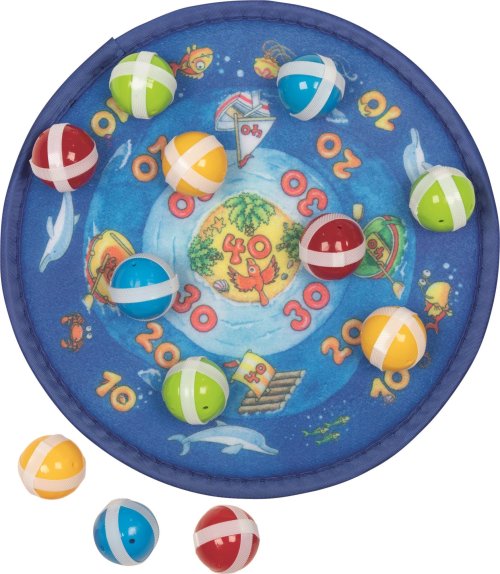 Na zadnej strane terča je pútko na zavesenie, funguje na báze suchého zipsu - loptičky majú pazúriky a terč chĺpky, 12 loptičiek v 4 rôznych farbách, ∅ 25 cm, podporuje koordináciu pohybov a zručnosť detí i dospelých.