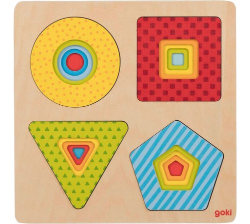 Viacvrstvová vkladačka 4v1 s motívom farebných geometrických tvarov. Skladačka obsahuje päť dielikov. Výhody: