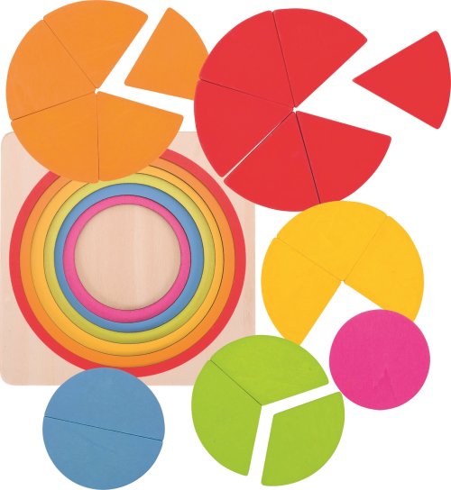 Podporuje rozvoj jemnej motoriky, poznávanie farieb, podkladová doska s pevným okrajom slúži ako podložka na skladanie, jednotlivé vrstvy sú vyfrézované, farba kružnice zodpovedá farbe skladaného kruhu, výborná didaktická pomôcka na výučbu delenia.