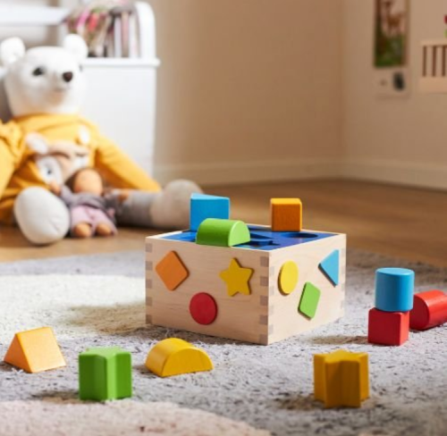 Drevená krabička s otváracím vekom na triedenie farebných tvarov je ideálna pre najmenšie deti a ich počiatočné skúmanie otvorov a tvarov.