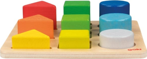 Rozmery: 15 x 15 x 3,7 cm. Obsahuje: podkladovú dosku z prírodného dreva a 9 farebných tvarov. GOKI patrí medzi najvýznamnejších európskych výrobcov hračiek s vysokou pedagogickou a didaktickou kvalitou. Firma kladie dôraz na bezpečnosť hračiek, ich zdravotnú nezávadnosť a dbá na obnoviteľné zdroje. Drevo je brané tam, kde môže dorastať. Používané dreviny sú javor, buk, orech, lipa, jaseň, borovica, breza a gumovník. Farby a laky pochádzajú od menších výrobcov.