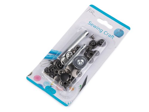 Kovové stláčacie gombíky využijete ako zapínanie na doplnky ako sú tašky, kabelky, batohy a pod. K aplikácii vám poslúži razič (dĺžka 7 cm), ktorý je súčasťou balenia. Gombíky sú vhodné na stredne silné materiály typu koženka, loneta a pod.