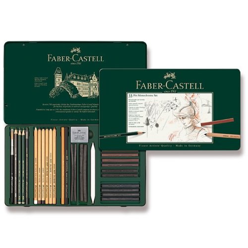 Sada 33 ks., ZLOŽENIE:, * grafitové ceruzky Castell 9000, * grafitové ceruzky Pitt Monochrome, * pastely Pitt, * pastely Pitt Monochrome, * uhly Pitt Monochrome, * umelecké gumy, biele doplnky, Monochromatické farby čiernej, každej umeleckej škole. Oživujú obrázky vitalitou a výrazom. Jedná sa o starú tradíciu, figurálne kresby, ktorá siaha až do renesancie, doplnená bielou farbou a tiene prehĺbenými čiernou farbou. Monochrómne pastelky Faber-Castell Pitt sa vracajú k tejto dlhej tradícii, kresleniu postáv, a preto sú pastelky určené na skicovanie tvrdšie ako bežné pastelové pastelky. Z tohto dôvodu čiary pri rozmazaní úplne nezmiznú. Súčasťou sady sú, bezolejové a olejové kresliace ceruzky na skicovanie a detaily., TIP: Na kreslenie môžete potrebovať aj umelecké papiere na suché výtvarné techniky a viazané skicare.
